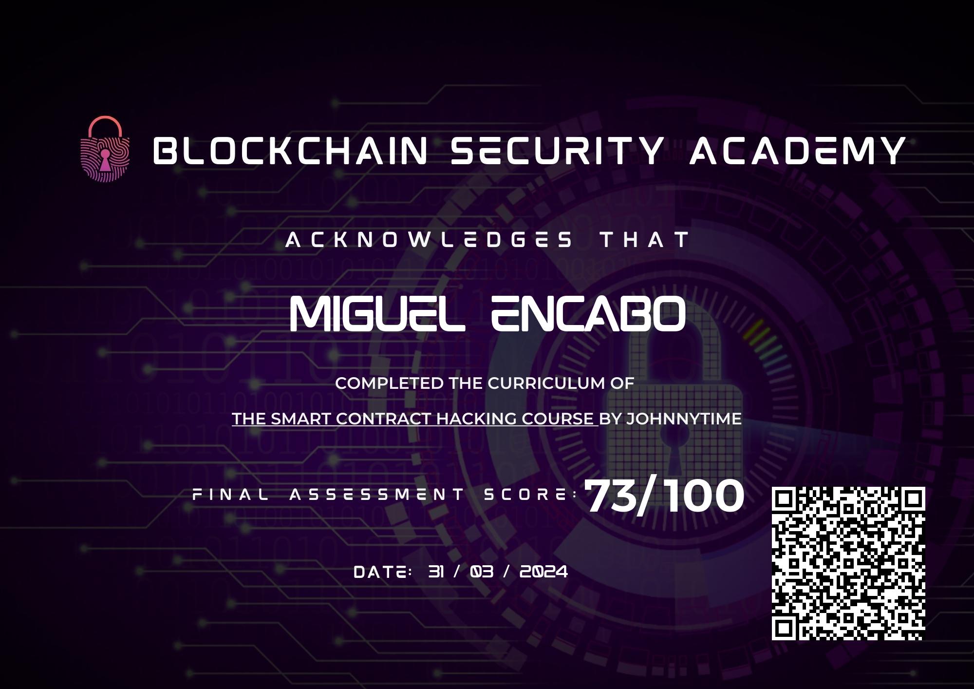 This SSCH Certificate confirms that the student has successfully finished the curriculum of the Smart Contract Hacking Course 🎓